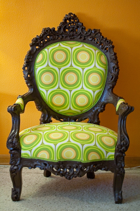 THE PROCESS: It didn’t have anything structurally wrong with it but the upholstery was full of holes and there were multiple coats of paint on the frame, including gold underneath the silver! To spruce it up we used heavy duty enamel paint from Sherwin-Williams in a deep chocolate brown and found this awesome fabric at ReproDepot. The upholsterer replaced the grass stuffing in the back and finished off the edges with a lime green gimp braid.