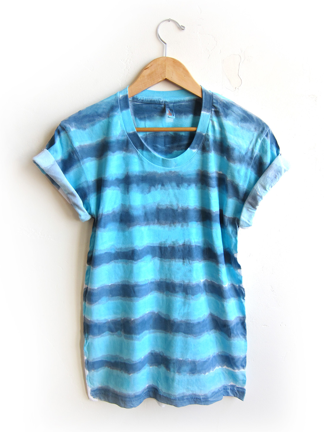 New for spring 2013, lovely feminine scoop neck tee hand dyed with alternating dark and light blue stripes.