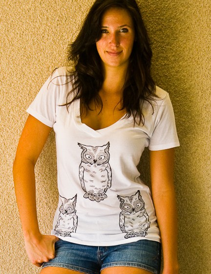Each tee features a sexy deep-v neck with three owls hand printed in black ink at the front of the tee. Each owl has a uniquely textured pattern since I hand print them just for you… no two shirts are ever alike!